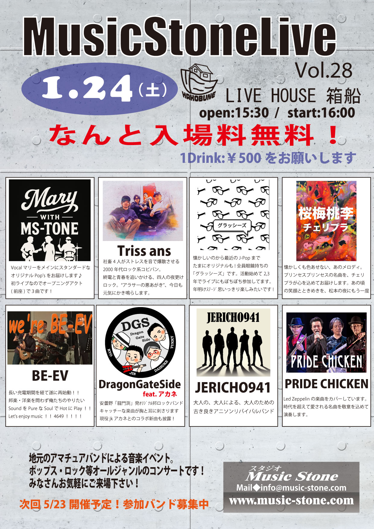 松本市のライブハウス「LIVE HOUSE 箱船」で開催されるイベント「MusicStoneLive Vol.28」に、Led Zeppelin のカバーバンド PRIDE CHICKEN が出演します。